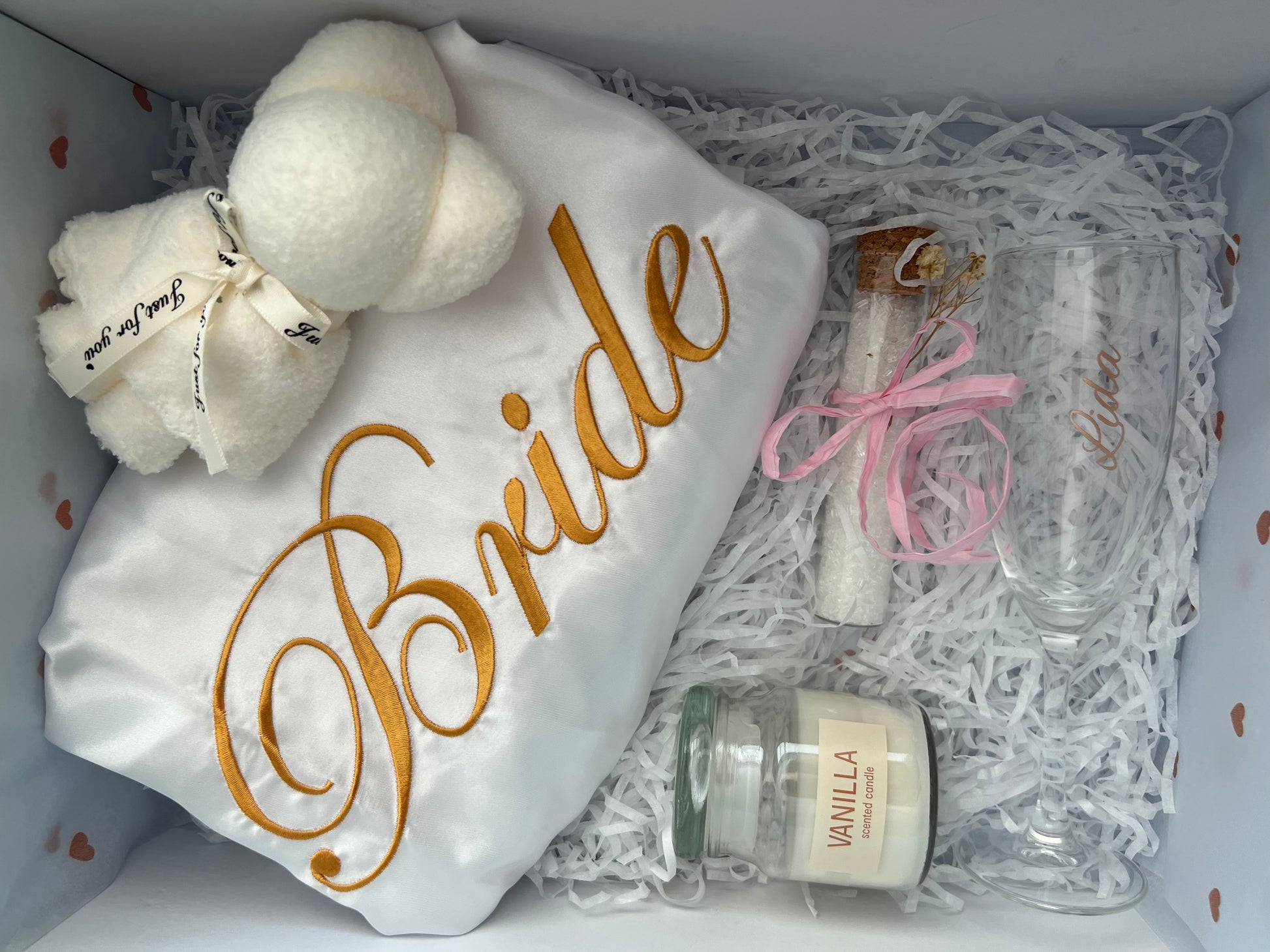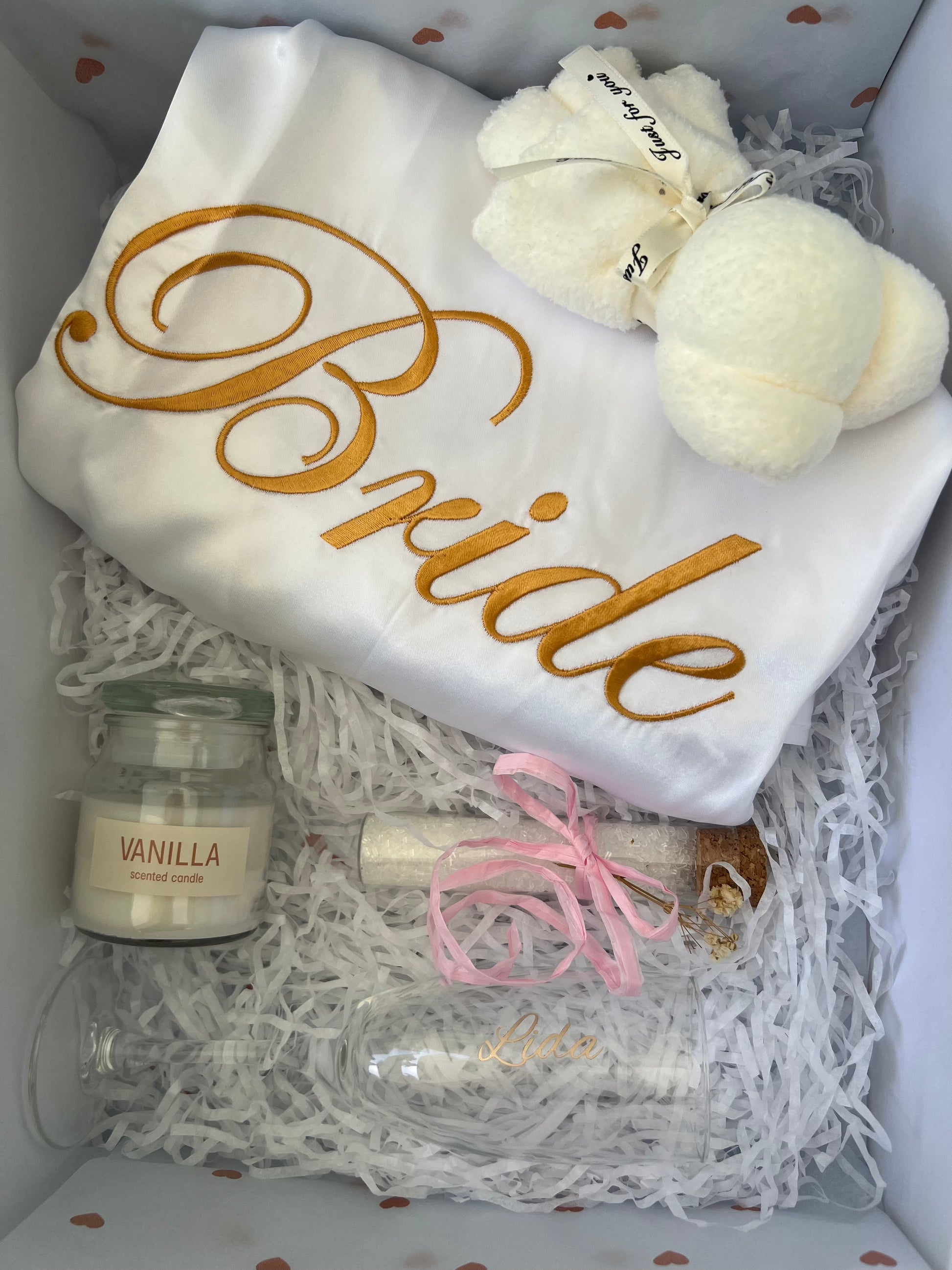 Treat the bride-to-be with our luxurious Bridal Gift Bundle. This bundle includes an embroidered robe, a soft bear-shaped face cloth, a vanilla candle, an ampule of Byron Magnesium Bath salt (infused with orange, pink grapefruit & rosemary oils), and a personalised champagne flute glass. Pamper her with the ultimate relaxation and make her feel extra special for her big day.